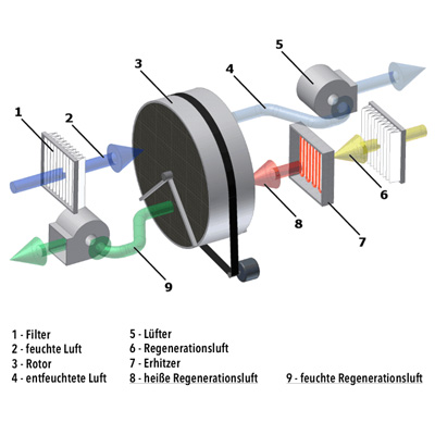 Die zu entfeuchtende Luft wird über ein mit diesem Material beschichteten Rotor geleitet, die so entfeuchtete Luft wird in den Raum zurückgeleitet.